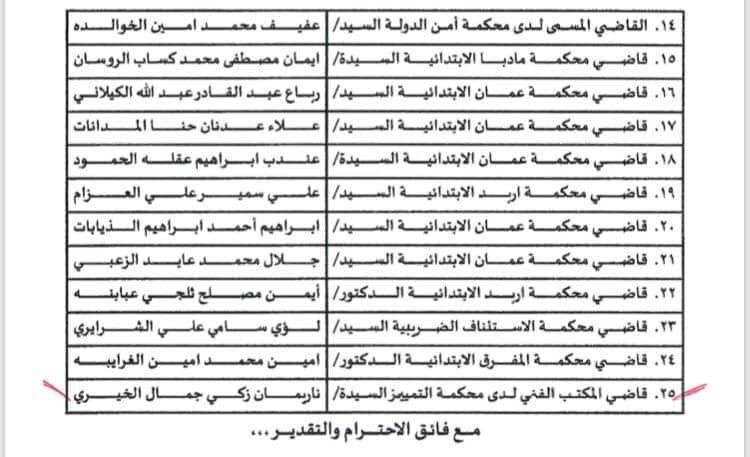 قرر المجلس القضائي الأردني، إلحاق عدد من القضاة الحاصلين على اعلى العلامات ببرنامج تدريب القيادات القضائية.