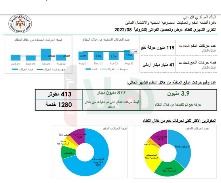ووصل عدد حركات الدفع الإلكتروني التي تم تنفيذها من خلال النظام شهر آب الماضي، إلى 3.9 مليون حركة.