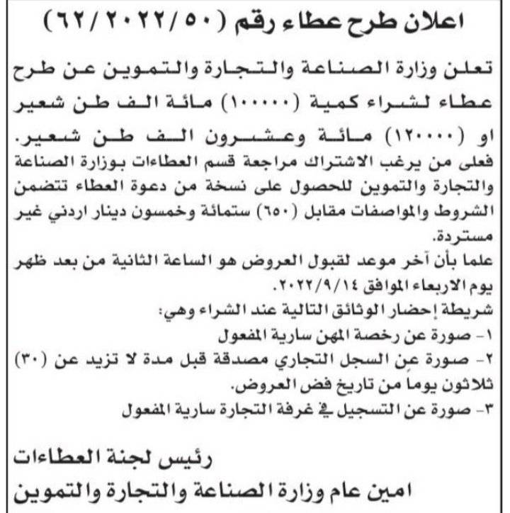 أعلنت وزارة الصناعة والتجارة والتموين الخميس عن طرح عطاء لشراء (100000) مائة ألف طن شعير.