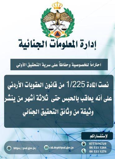 وأضافت أن المادة 1/225 من قانون العقوبات الأردني على نصت على: "يعاقب بالحبسحتى ثلاثة اشهر كل من يقوم بنشر أي وثيقة من وثائق التحقيق الجنائي".