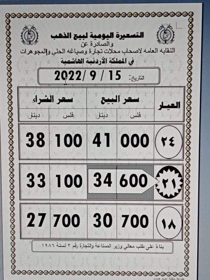 وبلغ سعر غرام الذهب عيار 21 الأكثر طلبا 34.60 دينارا لجهة البيع للمواطنين, مقابل 33.10 دينارا لجهة الشراء.