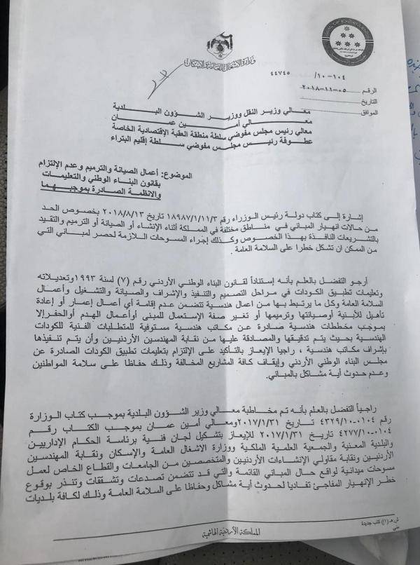 وبحسب الكتاب الذي ارفقه ملص، يظهر مخاطبة من وزير الاشغال العامة والاسكان الى الجهات المعنية والمسؤولة لاتخاذ الاجراءات والمسوحات اللازمة لحصر المباني التي من الممكن ان تشكل خطرا على السلامة العامة، وذلك للحد من حالات انهيار المباني في مختلف مناطق المملكة أثناء الانشاء او الصيانة او الترميم والتقيد بالتشريعات النافذة بهذا الخصوص استنادا الى قانون البناء الوطني الاردني رقم "7" لسنة 1993 وتعديلاته .