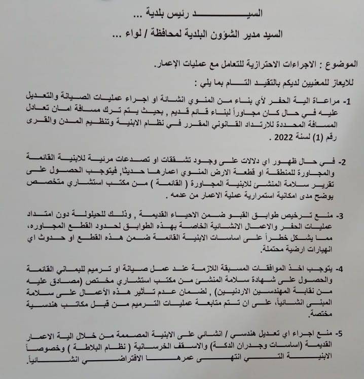 تعميم للبلديات حول الإجراءات الاحترازية للتعامل مع عمليات الإعمار - تفاصيل