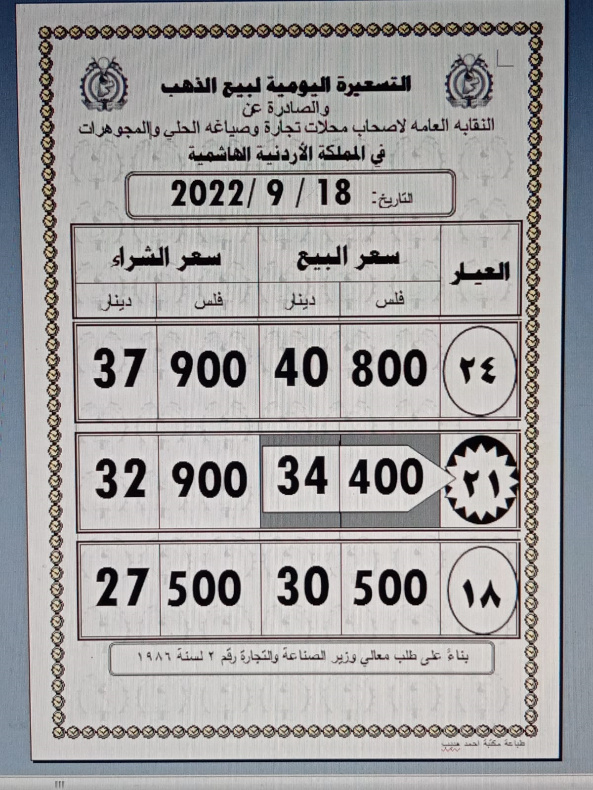 ووفق نقابة أصحاب محلات تجارة وصياغة الحلي والمجوهرات، بلغ سعر بيع غرام الذهب عيار 21 الأكثر رغبة من الأردنيين بالسوق المحلية عند 34,40 دينارا لغايات شراء المواطنين من محلات الصاغة.