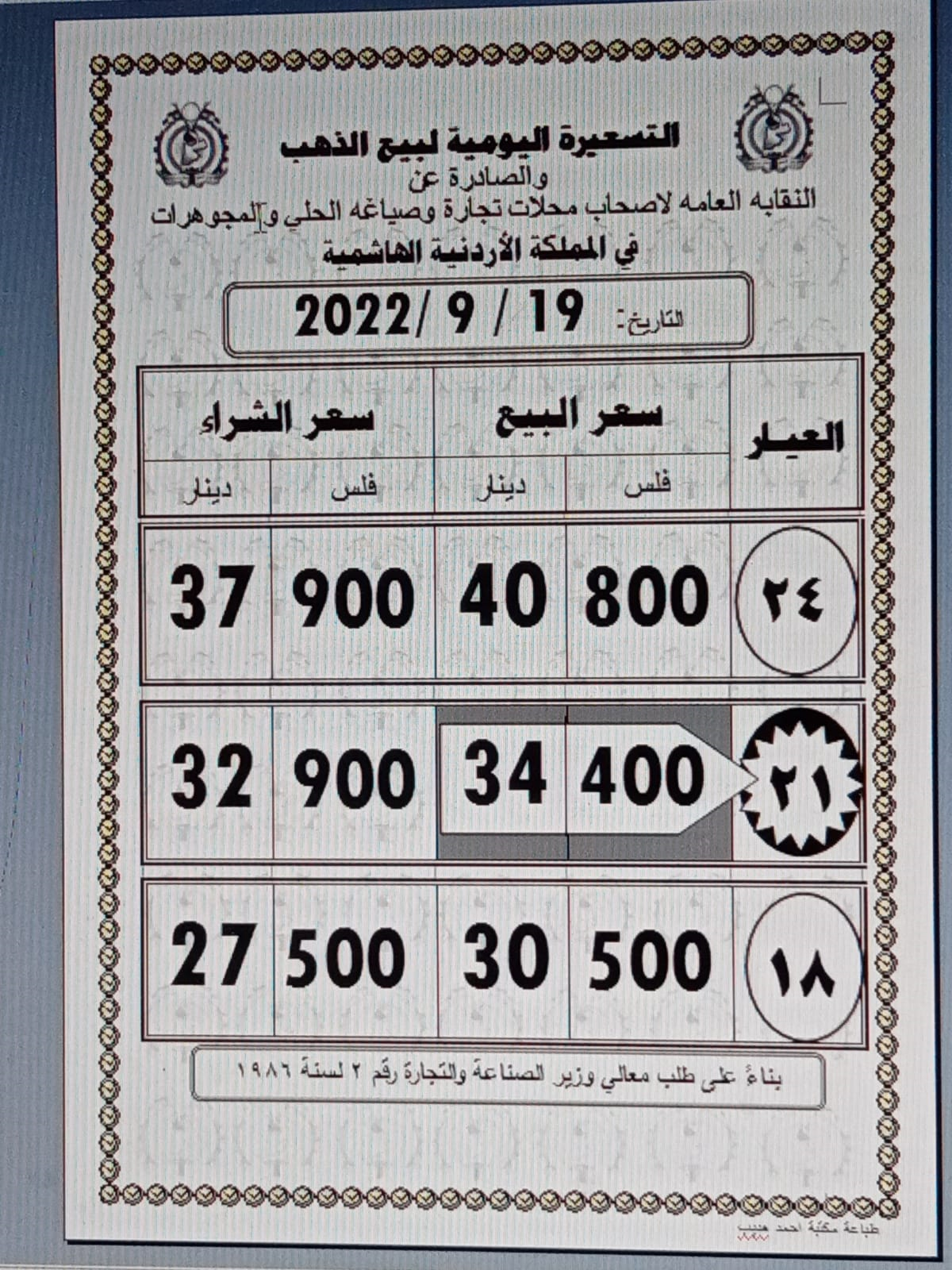 ووفق نقابة أصحاب محلات تجارة وصياغة الحلي والمجوهرات، بلغ سعر بيع غرام الذهب عيار 21 الأكثر رغبة من الأردنيين بالسوق المحلية عند 34,40 دينارا لغايات شراء المواطنين من محلات الصاغة.