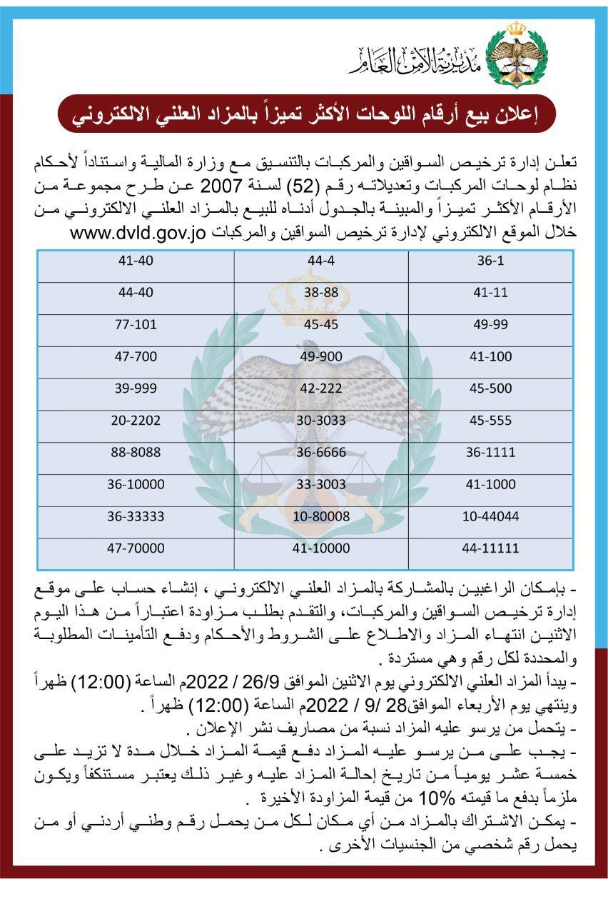 أعلنت إدارة ترخيص السواقين والمركبات بالتنسيق مع وزارة المالية عن طرح مجموعة من الأرقام الاكثر تميزًا للبيع بالمزاد العلني الالكتروني من خلال الموقع الإلكتروني لإدارة ترخيص السواقين والمركبات .
