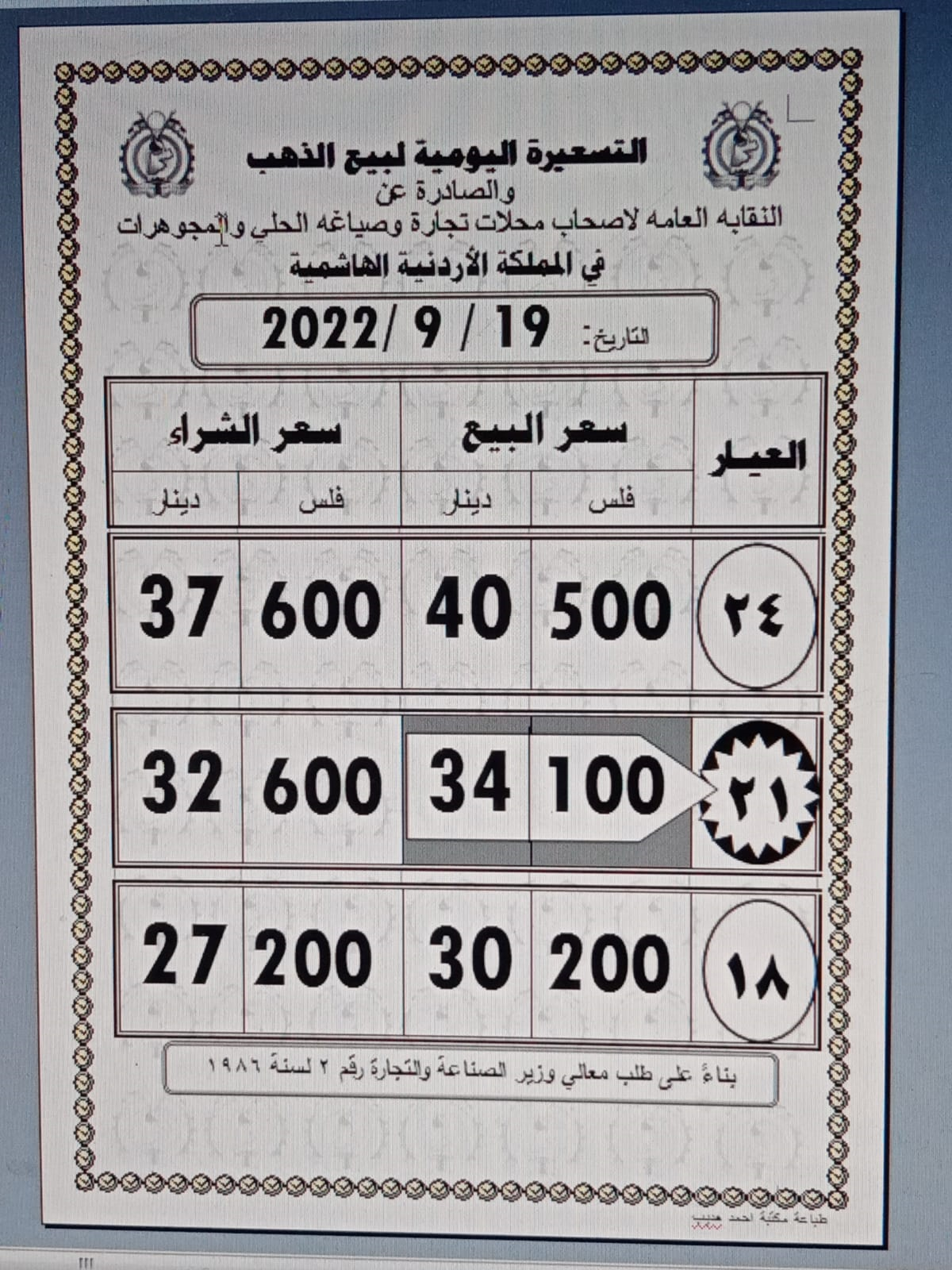 وبلغ سعر بيع غرام الذهب عيار 21 الأكثر رغبة من الأردنيين بالسوق المحلية عند 34,90 دينارا لغايات شراء المواطنين من محلات الصاغة.