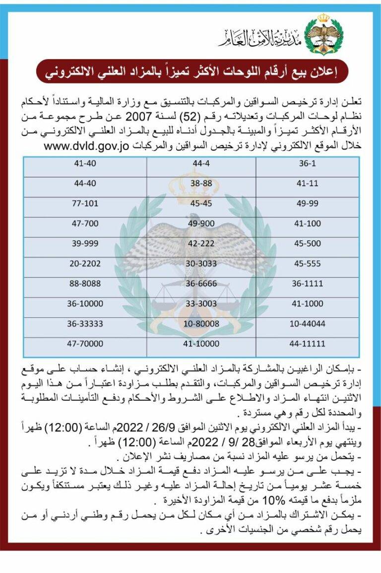 : أعلنت مديرية الأمن العام، اليوم الإثنين، فتح باب لمزاد العلني، على بعض أرقام لوحات المركبات، وفق نظام لوحات المركبات وتعديلاته.
