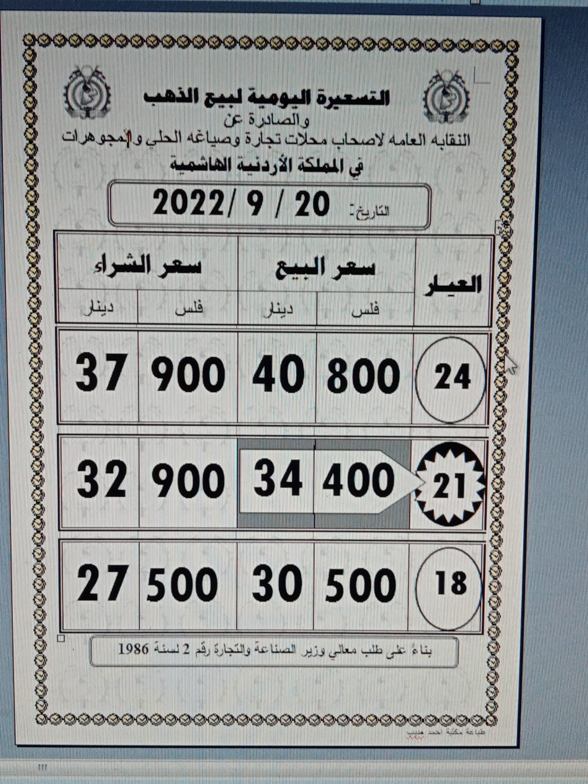 ووفق نقابة أصحاب محلات تجارة وصياغة الحلي والمجوهرات، بلغ سعر بيع غرام الذهب عيار 21 الأكثر رغبة من الأردنيين بالسوق المحلية عند 34,40 دينارا لغايات شراء المواطنين من محلات الصاغة.