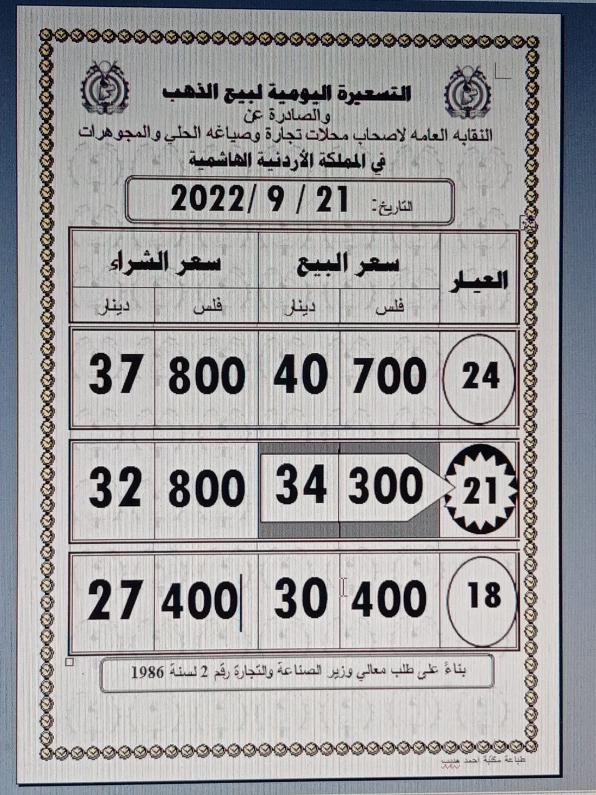 ووفق نقابة أصحاب محلات تجارة وصياغة الحلي والمجوهرات، بلغ سعر بيع غرام الذهب عيار 21 الأكثر رغبة من الأردنيين بالسوق المحلية عند 34,30 دينارا لغايات شراء المواطنين من محلات الصاغة.