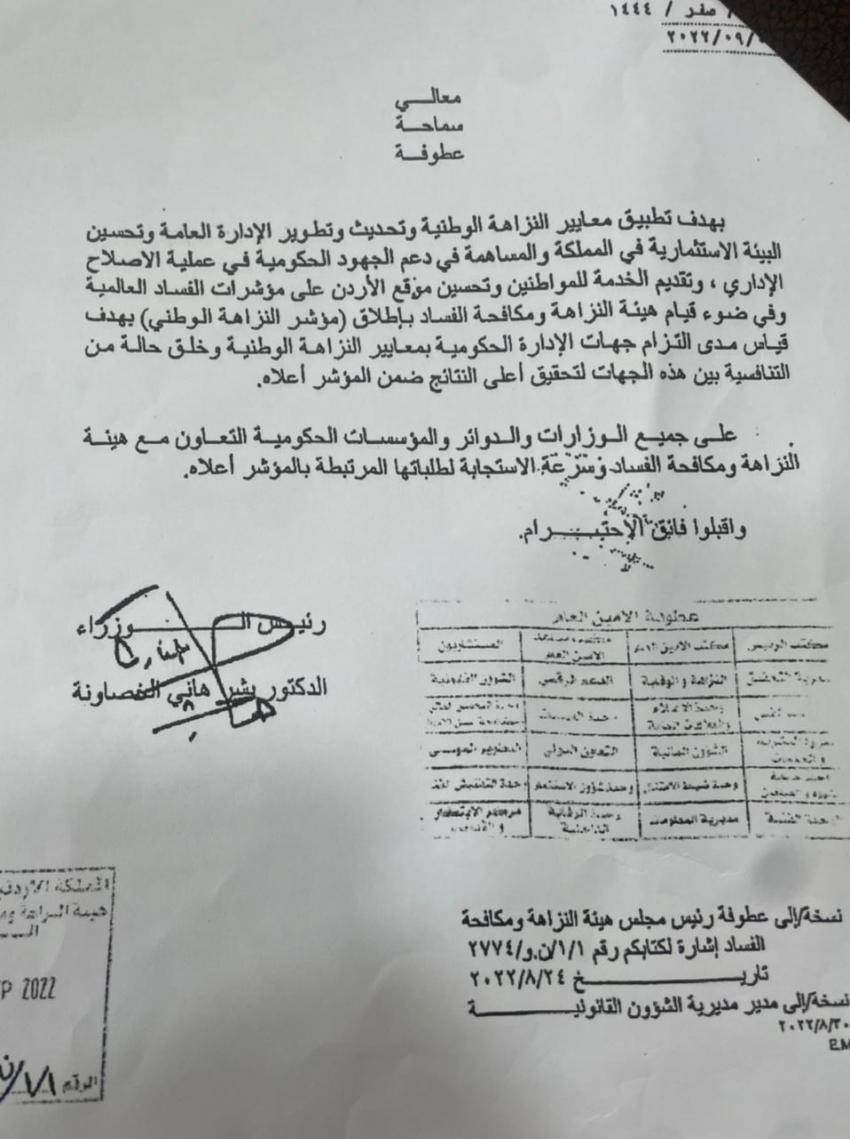 اوعز رئيس الوزراء الدكتور بشر الخصاونة للتعاون مع هيئة النزاهة ومكافحة الفساد وسرعة الاستجابة لطلباتها المرتبطة بمؤشر النزاهة الوطني.