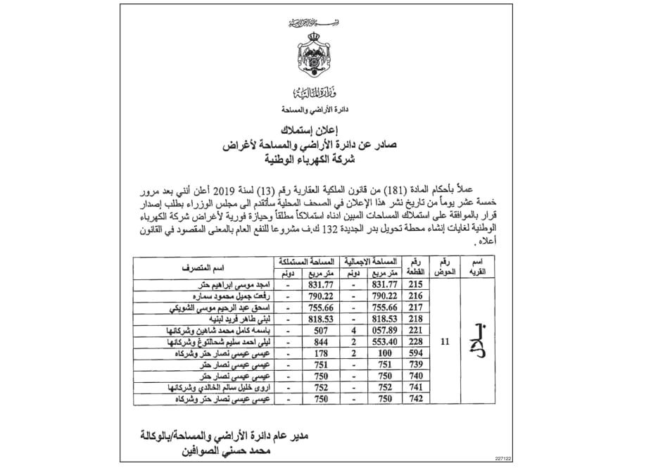 ويأتي ذلك، لغايات إنشاء محطة تحويل بدر الجديدة 132 ك.ف مشروعا للنفع العام، عملا بأحكام المادة (181) من قانون الملكية العقارية رقم (13) لسنة 2019.