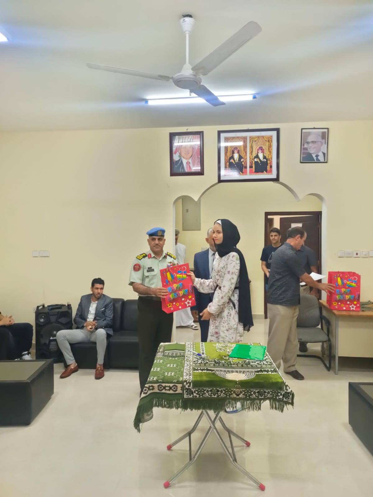 وفي الختام تقدم النادي من خلال  رئيس مجلس الإدارة في محافظة ظفار بتقديم درع تذكاري إلى الملحق العسكري  العميد طايع اللواما والذي بدوره قدم أيضا درع القوات المسلحة إلى إدارة النادي وتبادل الجميع الحوار البناء والهادف وتضمن التأكيد على الولاء والانتماء إلى الأردن الغالي وسلطنة عمان الحبيبة.
