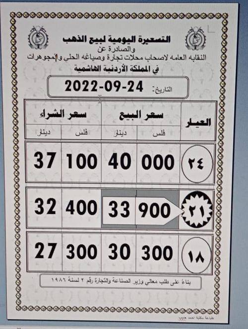 كما بلغ سعر بيع غرام الذهب عيار 21 الأكثر رغبة من الأردنيين بالسوق المحلية عند 33.90 دينارا لغايات شراء المواطنين من محلات الصاغة