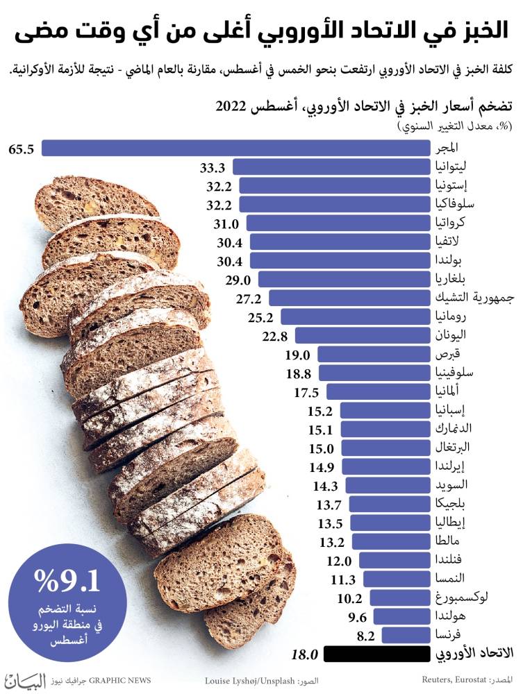 ووفقاً لتقارير إعلامية نقلت عن وكالة الإحصاء التابعة للاتحاد الأوروبي، «يوروستات»، بلغ متوسط نسبة ارتفاع أسعار الخبز في دول التكتّل أغسطس الماضي، 18 في المئة، مقارنة بما كان عليه الحال قبل عام، علماً أن نسبة ارتفاع سعر المادة المذكورة في أغسطس 2021 كانت 3 في المئة، مقارنة بالعام الذي سبقه.