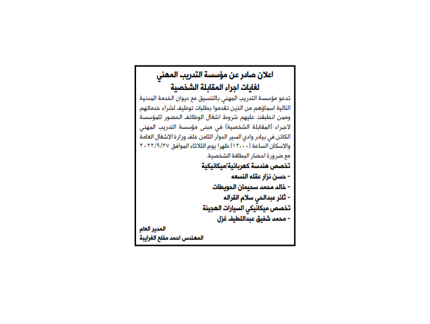 وتعقد المقابلة الشخصية في مبنى المؤسسة يوم الثلاثاء الموافق 27/9/2022 في تمام الساعة 12 ظهرا.