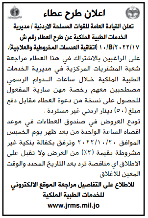 : القيادة العامة للقوات المسلحة ، مديرية الخدمات الطبية الملكية عن طرح عطاء (اتفاقية عدسات المخروطية والعلاجية).