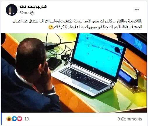 أما الناشط محمد كاظم فقال: ”ياللفضيحة ويا للعار.. كاميرات مبنى الأمم المتحدة تكشف دبلوماسيا عراقيا منشغلا عن أعمال الجمعية العامة للأمم المتحدة في نيويورك بمتابعة مباراة كرة قدم".