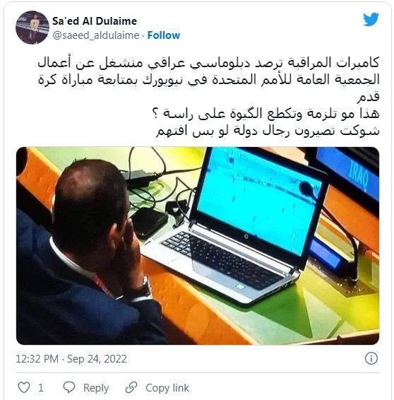 وقال المدون صائد الدليمي في تغريدة له عبر حسابه على تويتر: ”كاميرات المراقبة ترصد دبلوماسيا عراقيا منشغلا عن أعمال الجمعية العامة للأمم المتحدة في نيويورك بمتابعة مباراة كرة قدم.. هذا مو تلزمة وتكطع الگيوة على راسه؟ شوكت تصيرون رجال دولة لو بس افتهم".