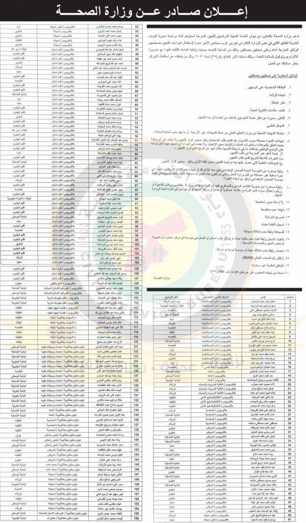 الصحة تدعو صيادلة وأطباء وفنيين لاستكمال اجراءات التعيين (أسماء)