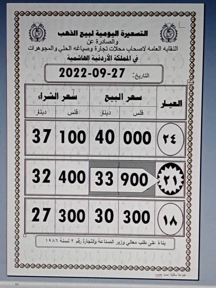 ويشمل التقريــر أسعار المعدن عيارات ( 24، 21، 18) ، كونها الأكثر تداولا في الأردن.