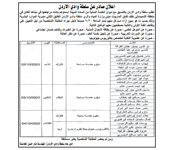 : دعت سلطة وادي الأردن بالتنسيق مع ديوان الخدمة المدنية، مرشحين لوظائف الفئتين الأولى والثانية، لإجراء المقابلة الشخصية.