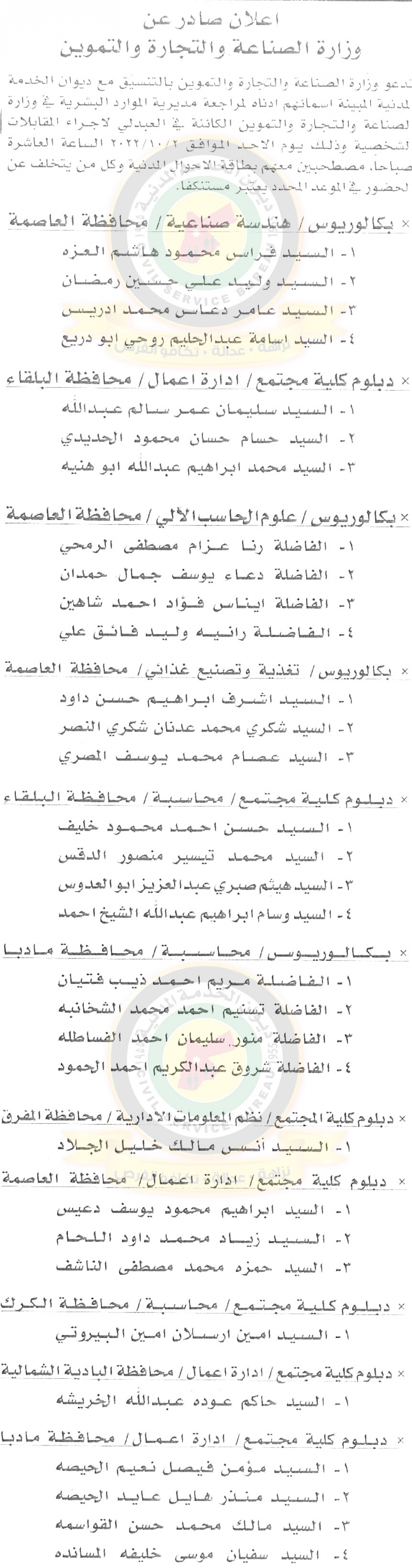 : دعت وزارة الصناعة والتجارة والتموين بالتنسيق مع ديوان الخدمة المدنية، مرشحين للتعين إلى إجراء المقابلات الشخصية.