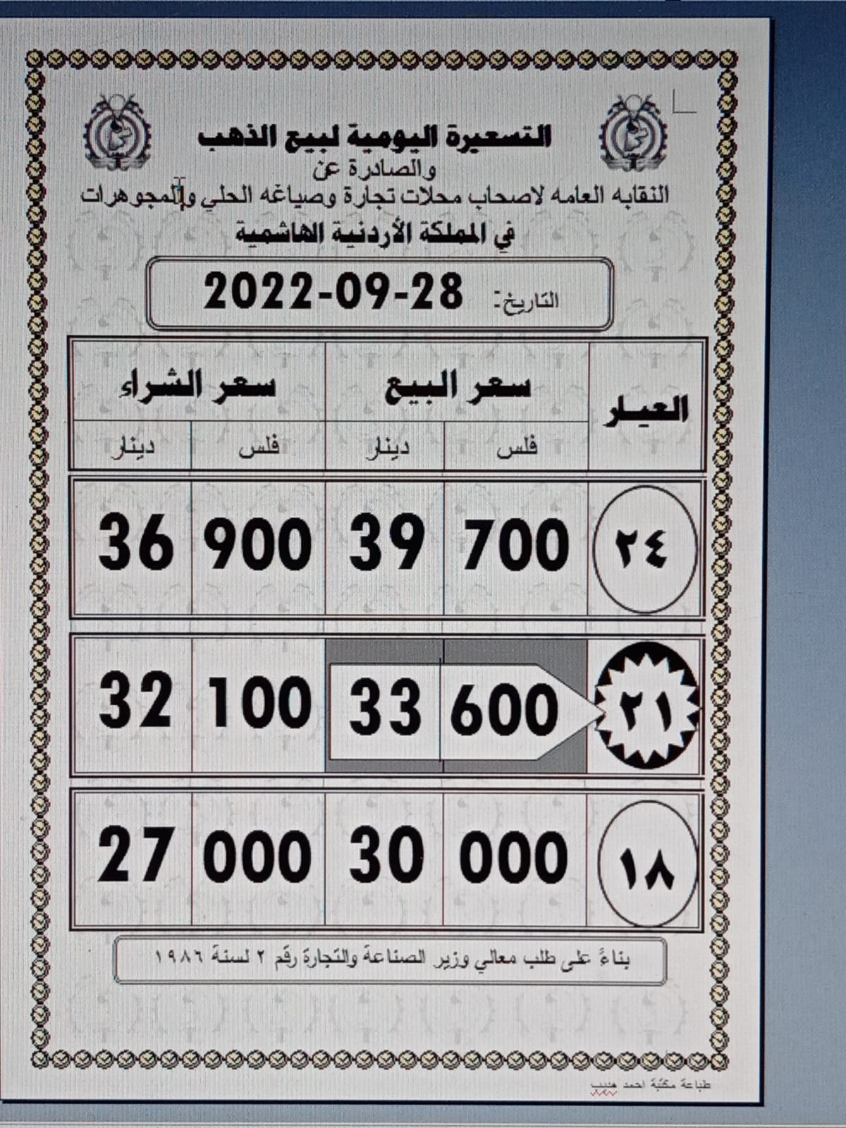 ووفق نقابة أصحاب محلات تجارة وصياغة الحلي والمجوهرات، بلغ سعر بيع غرام الذهب عيار 21 الأكثر رغبة من الأردنيين بالسوق المحلية عند 33.60 دينارا لغايات شراء المواطنين من محلات الصاغة.