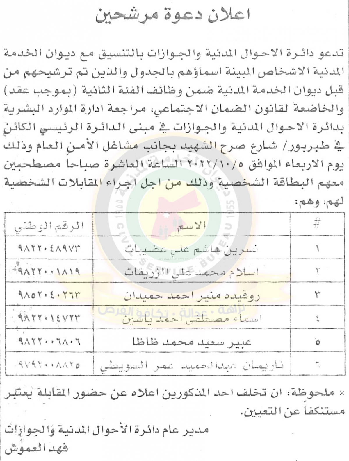 : دعت دائرة الأحوال المدنية والجوازات بالتنسيق مع ديوان الخدمة المدنية، مرشحين للتعين إلى إجراء المقابلات الشخصية.