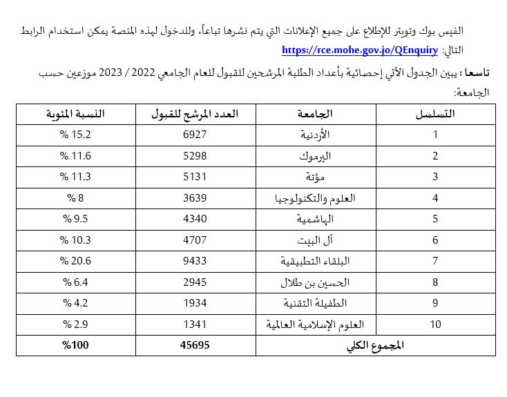 وأرسلت الوحدة رسائل نصية للطلبة تتضمن نتائج ترشيحهم ضمن قائمة القبول الموحد، وجرى إعلان قائمة الطلبة المرشحين للقبول على الموقع الإلكتروني لوحدة تنسيق القبول الموحد على الرابط www.admhec.gov.jo، حيث يمكن لكل طالب الحصول على نتيجته باستخدام الرقم الوطني أو رقم الجلوس في شهادة الثانوية العامة، إضافةً إلى الإطلاع على الحدود الدنيا لمعدلات القبول التنافسية في جميع التخصصات ولمختلف الشهادات.
