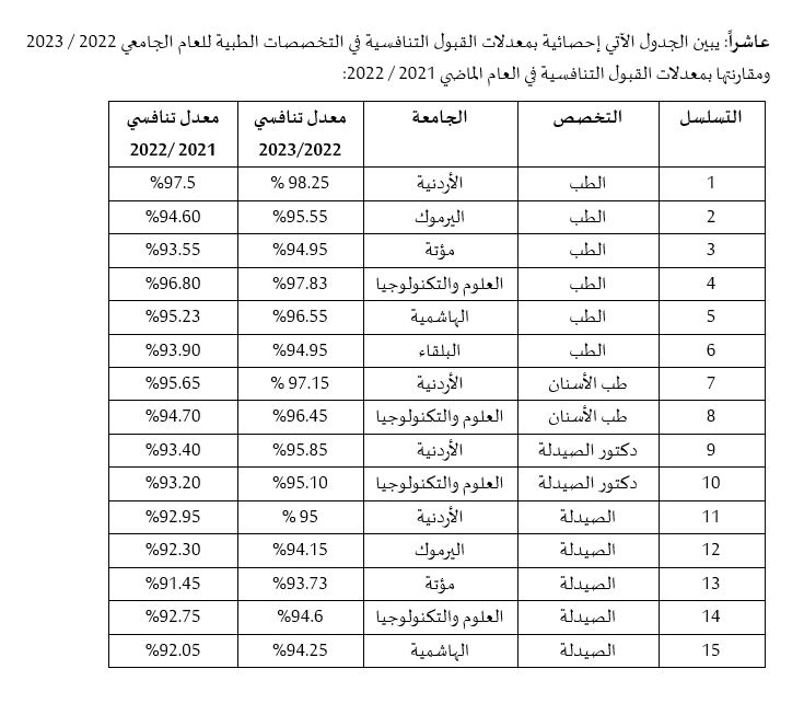 ووفق التقرير، بلغ عدد الطلبة المتقدمين بطلبات صحيحة للقبول الموحد ومسددين لرسم تقديم الطلب (71621) طالباً وطالبة، في حين بلغ عدد الطلبة المرشحين للقبول (45695) طالباً وطالبة، كما بلغ عدد الطلبة غير المرشحين للقبول (25926) طالباً وطالبة.