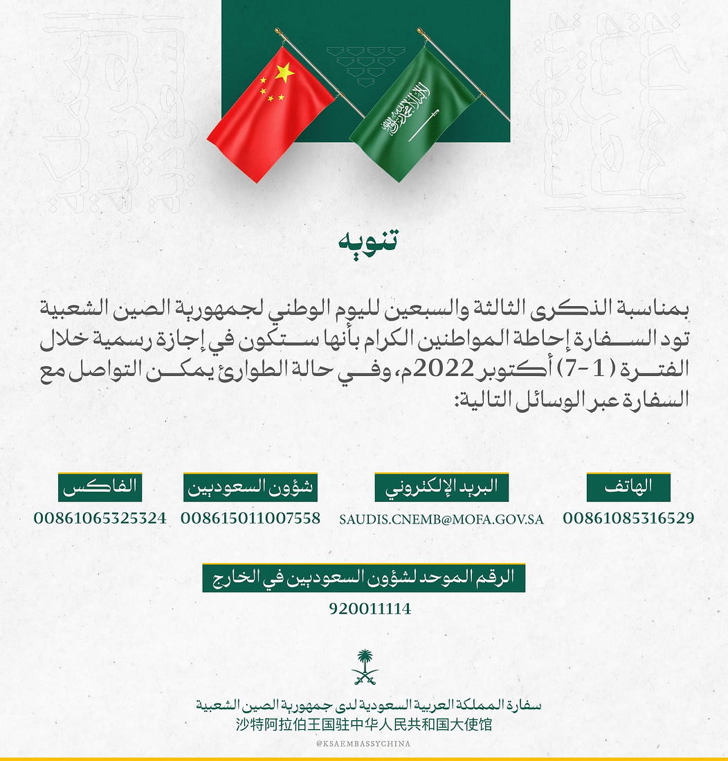 تغلق السفارة السعودية في بكين يوم غدٍ السبت ولمدة ٧ أيام، بمناسبة الذكرى الثالثة والسبعين لليوم الوطني لجمهورية الصين الشعبية.