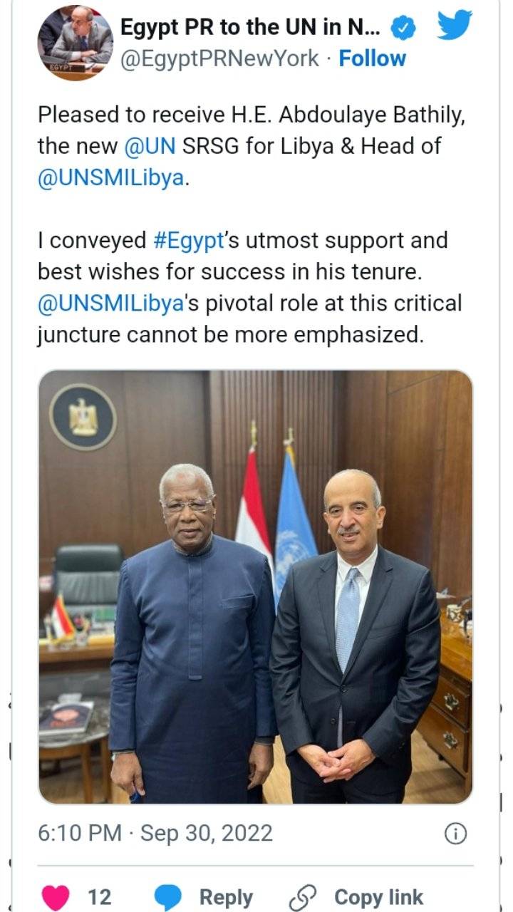التقى المبعوث الأممي إلى ليبيا عبدالله باتيلي، مندوب مصر الدائم لدى الأمم المتحدة السفير أسامة عبدالخالق.