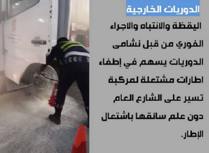 تعاملت إحدى الدوريات الخارجية مساء اليوم السبت مع حالة اشتعال أحد الإطارات الأمامية لمركبة كانت تسير على الطريق العام دون ملاحظة ذلك من قبل سائقها.