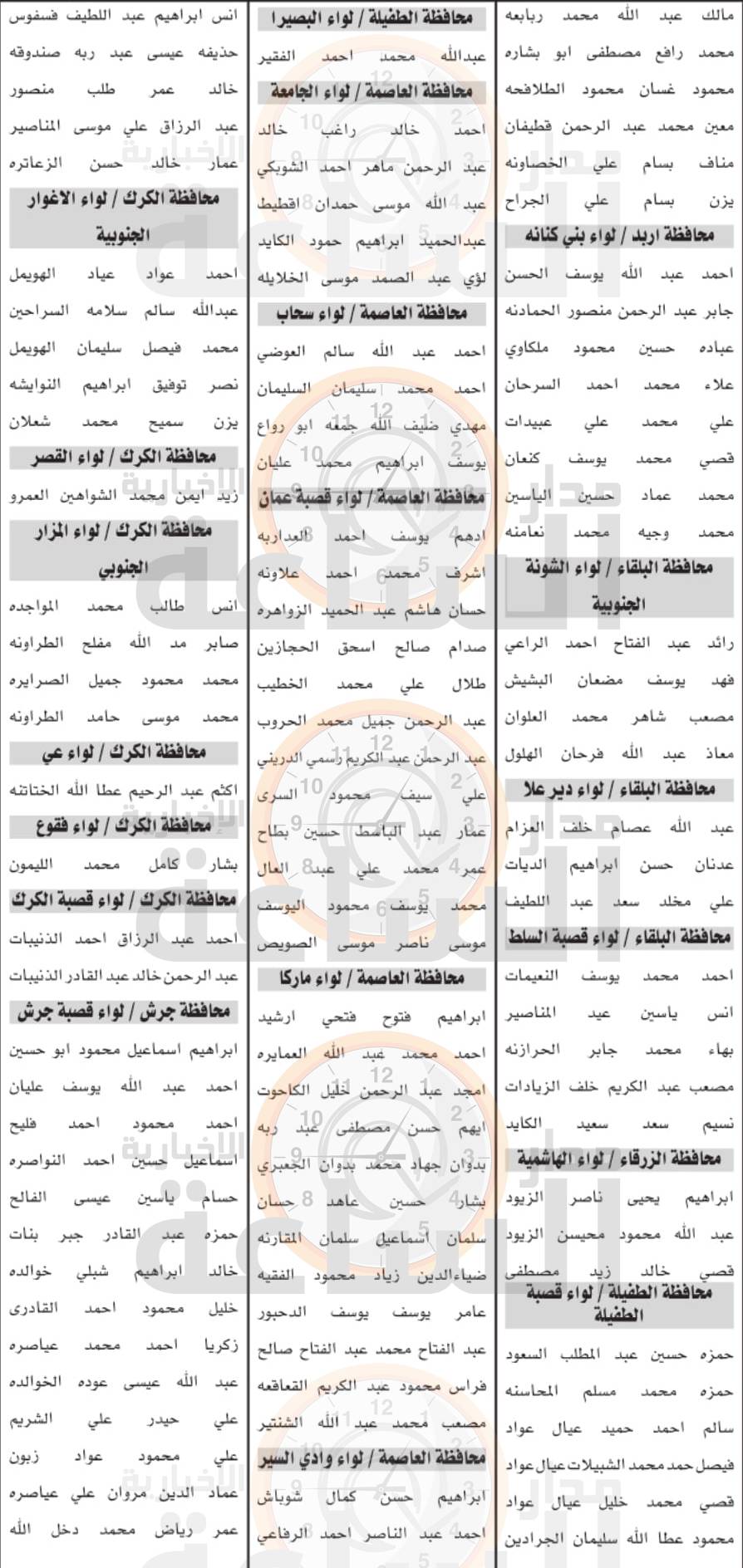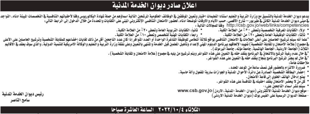 دعا ديوان الخدمة المدنية بالتنسيق مع وزارة التربية والتعليم استنادا لتعليمات اختيار وتعيين الموظفين في الوظائف الحكومية المرشحين التالية اسماؤهم من حملة شهادة البكالوريوس وفقا لأحقياتهم التنافسية ّفي التخصصات المبينة ادناه؛ التواجد بمبنى ديوان الخدمة المدنية؛ حسب الأيام والاوقات الموضحة ادناه؛ لحضور الامتحان التنافسي الإلكتروني المبني على الكفايات والمحددة من خلال الدخول إلى الرابط التالي: