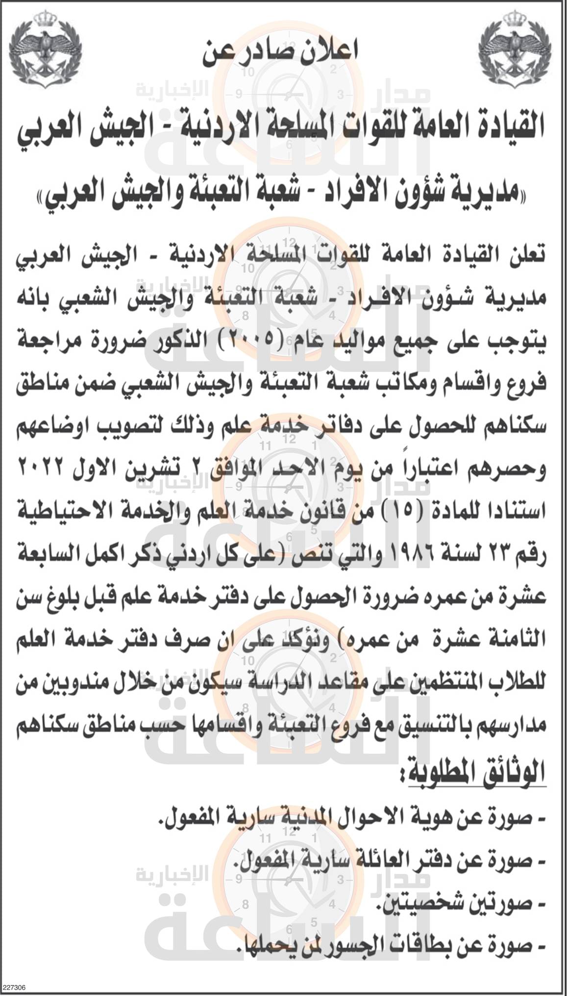 أعلنت القيادة العامة للقوات المسلحة الاردنية - الجيش العربي - مديرية شؤون الأفراد - شعبة التعبئة والجيش الشعبي؛ انه يتوجب على جميع مواليد عام 2005 الذكور ضرورة مراجعة فروع واقسام ومكاتب شعبة التعبئة والجيش الشعبي ضمن مناطق سكناهم للحصول على دفاتر خدمة علم وذلك لتصويب اوضاعهم وحصرهم اعتباراً من يوم الاحد الموافق 2 تشرين الأول 2022