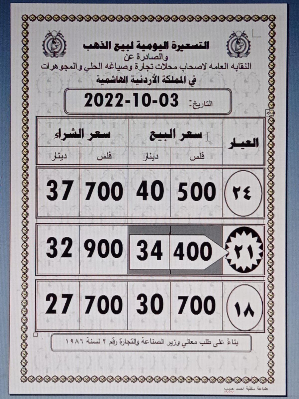 ووفق نقابة أصحاب محلات تجارة وصياغة الحلي والمجوهرات، اليوم الاثنين بلغ سعر بيع غرام الذهب عيار 21 الأكثر رغبة من الأردنيين بالسوق المحلية عند 34.40 دينارا لغايات شراء المواطنين من محلات الصاغة.