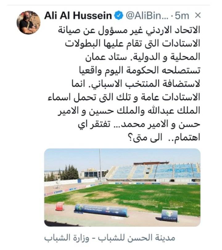 مضيفا ان الاستادات العامة وتلك التي تحمل اسماء الملك عبدالله والملك حسين والامير حسن والامير محمد تفتقد اي اهتمام ...الى متى ؟