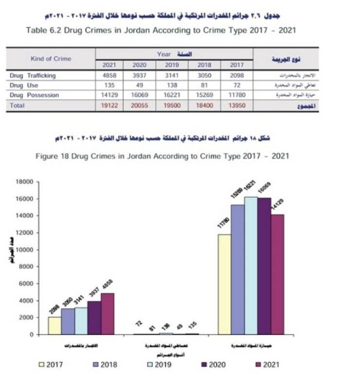 أظهر التقرير الإحصائي الجناني الصادر عن إدارة المعلومات الجنائية التابعة لمديرية الأمن العام، ارتفاع جرائم الاتجار بالمخدرات وتعاطي المواد الخطرة وحيازتها للفترة ما بين 2017-2021.