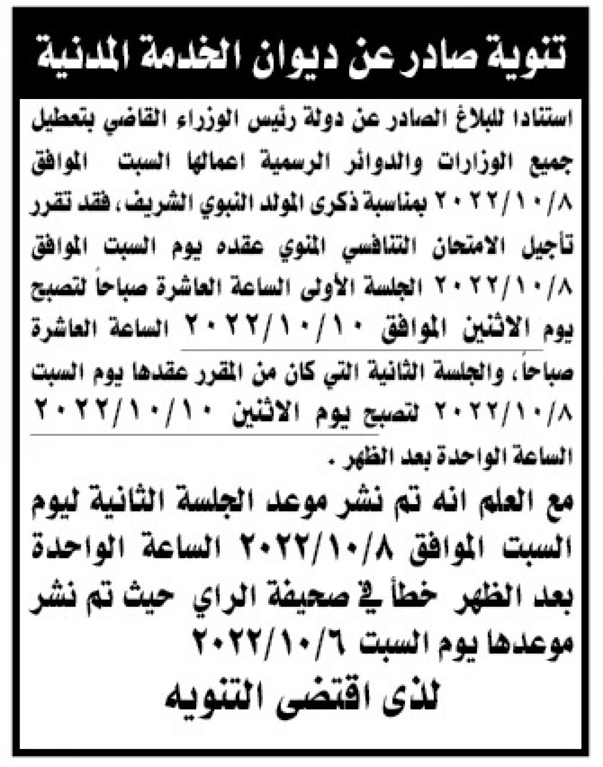 نيروز الإخبارية : قرر ديوان الخدمة المدنية تأجيل الامتحان التنافسي المنوي عقده السبت 8 تشرين الأول الجاري إلى يوم الإثنين الذي يليه.