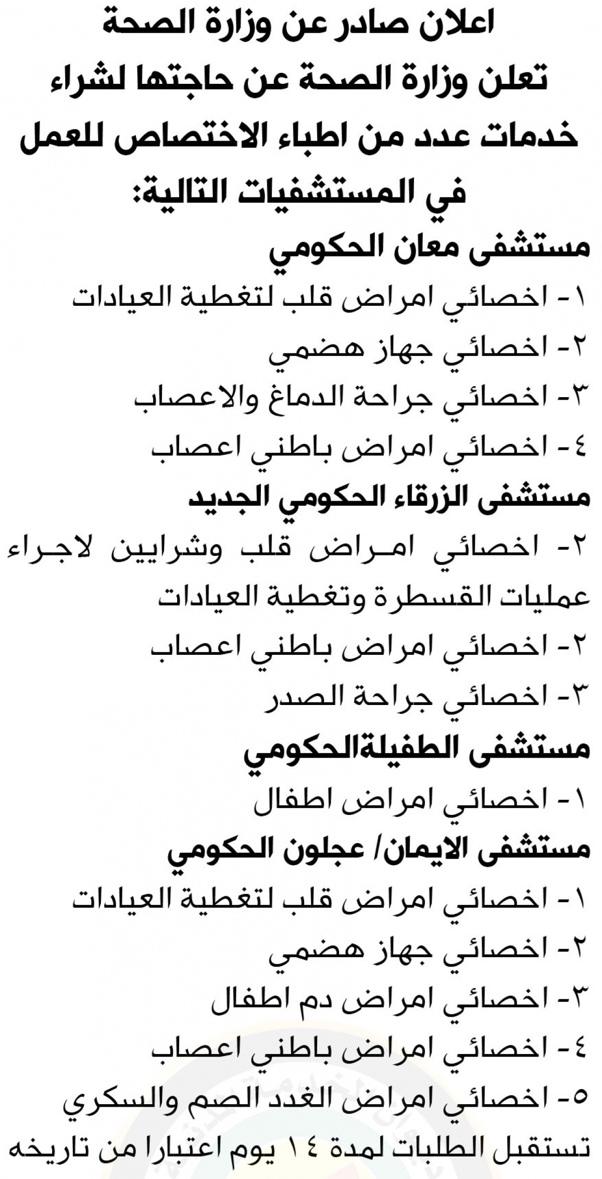 ومستشفى الايمان الحكومي في عجلون يحتاج إلى ( اخصائي امراض قلب لتغطية العيادات، اخصائي جهاز هضمي، أخصائي أمراض دم اطفال، اخصائي امراض باطني أعصاب، أخصائي أمراض الغدد الصم والسكري).