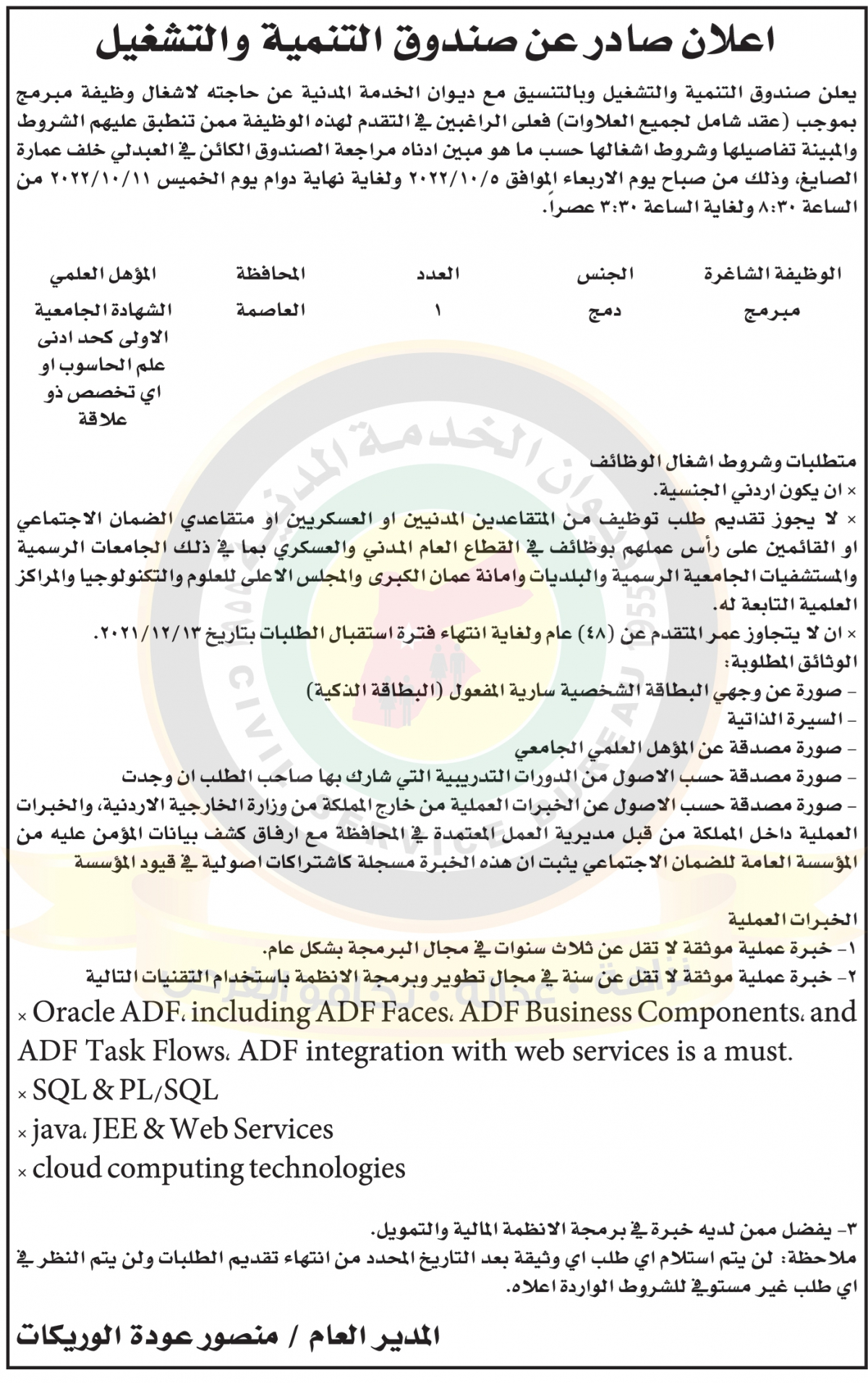 نيروز الإخبارية : أعلن صندوق التنمية والتشغيل، بالتعاون مع ديوان الخدمة المدنية، عن حاجته لإشغال وظيفة مُبرمج، بموجب عقد شامل لجميع العلاوات.