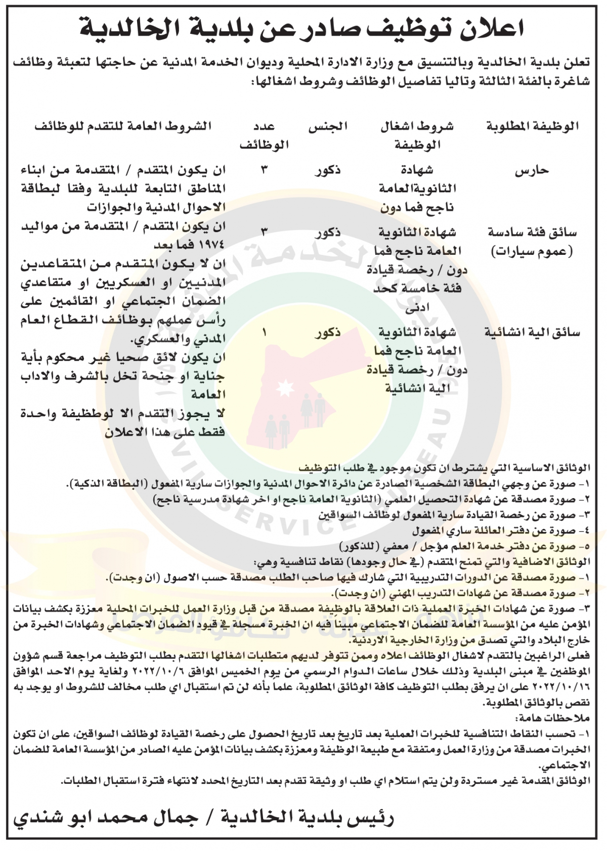 : أعلنت بلدية الخالدية، وبالتنسيق مع وزارة الإدارة المحلية وديوان الخدمة المدنية عن حاجتها لتعبئة عدد من وظائف الفئة الثالثة.