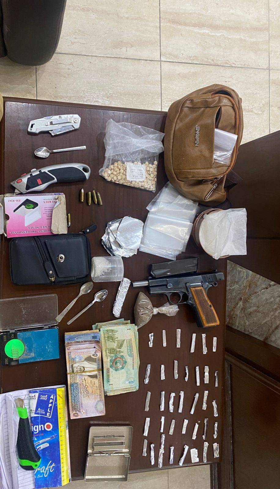 فيما توجهت قوة أمنية أخرى إلى إحدى مناطق جنوب العاصمة، والتي تواجد بها المصنف الخطِر الثاني وجرت مداهمته داخل مركبة كان يستقلها، وحاول عند ذلك الفرار من المكان، حيث قامت القوة بملاحقته وإيقافه وإلقاء القبض عليه، وضبط بحوزته سلاح ناري، وكمية معدة للبيع من مادة الهيروين والكريستال والحشيش والحبوب المخدرة.