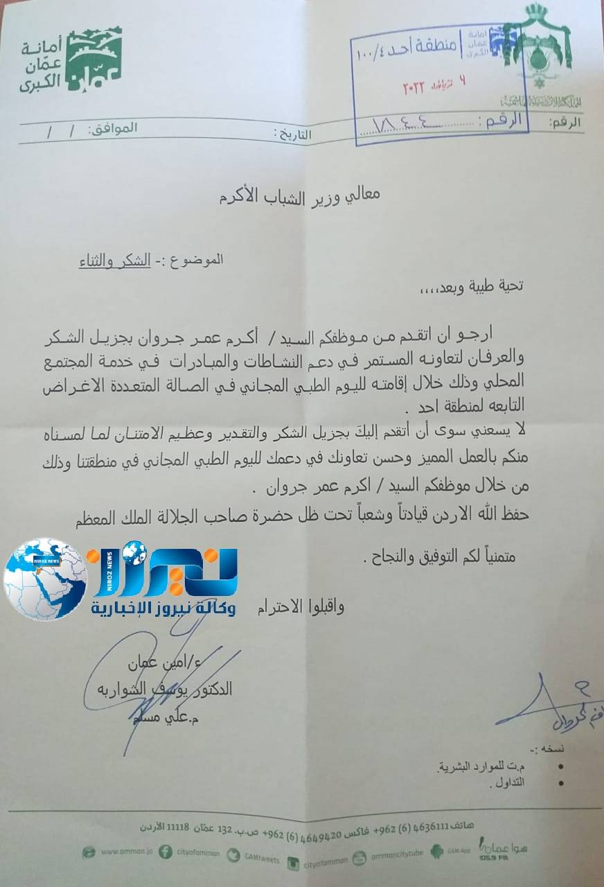 أمين عمان يشكر رئيس مبادرة مشروعك وطنك على إنجازه المتميز للتظاهرة الطبية في قاعة أُحُد _ وثيقة