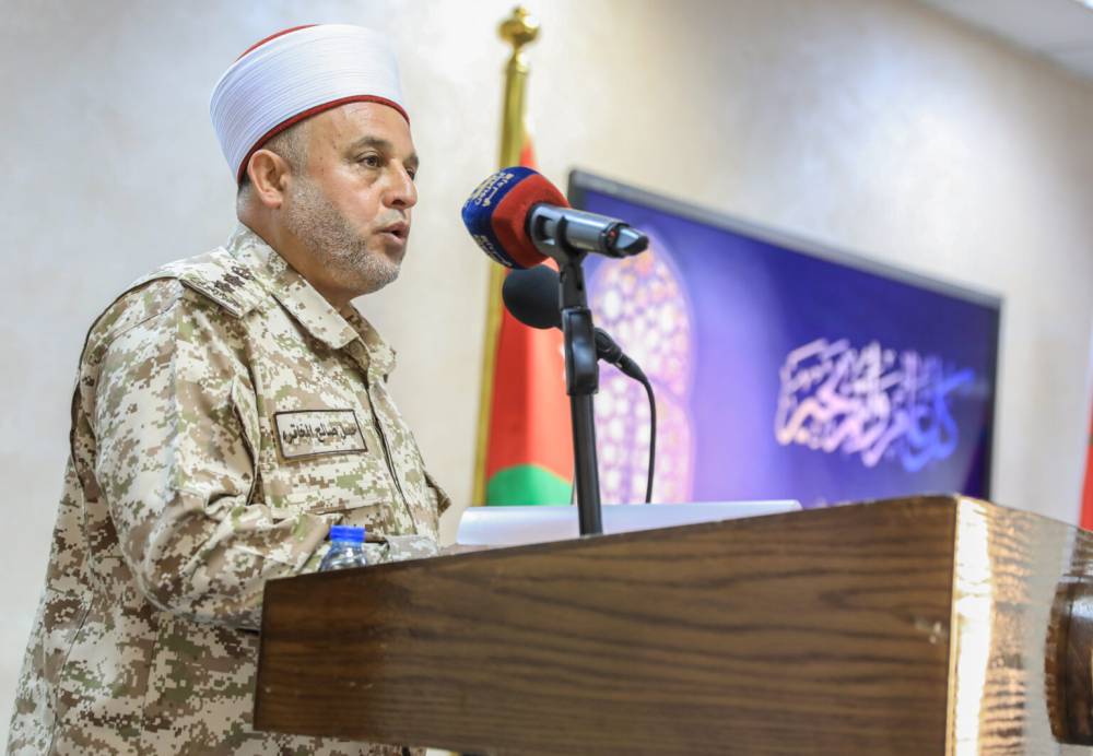 وبدأ الاحتفال بتلاوة آيات عطرة من الذكر الحكيم، وألقى بعدها مفتي القوات المسلحة العقيد إمام حسن المخاترة كلمةً قال فيها: "لقد دأبت القوات المسلحة الأردنية - الجيش العربي المصطفوي إلى جانب المؤسسات الدينية، على الاحتفال بذكرى ميلاد المصطفى، تعبيراً عن حبه العظيم، وتذكيراً بالقيم التي دعا إليها وإبراز شمائله، ليكون نبراساً للمهتدين وتذكرة للمؤمنين، فجزى الله قيادتنا الهاشمية الحكيمة خيراً على دعم هذا الجهد الذي يدل على صدق الانتماء والولاء لصاحب الذكرى العطرة".