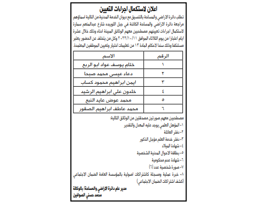 دعت دائرة الأراضي والمساحة بالتنسيق مع ديوان الخدمة المدنية، مرشحين لاستكمال إجراءات تعيينهم، وذلك خلال 10 أيام اعتبارا من اليوم الثلاثاء 11/10/2022.