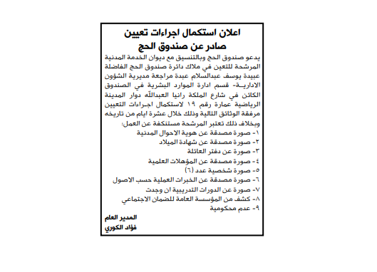 كما دعا صندوق الحج وبالتنسيق مع ديوان الخدمة المدنية، مرشحة لاستكمال إجراءات التعيين.