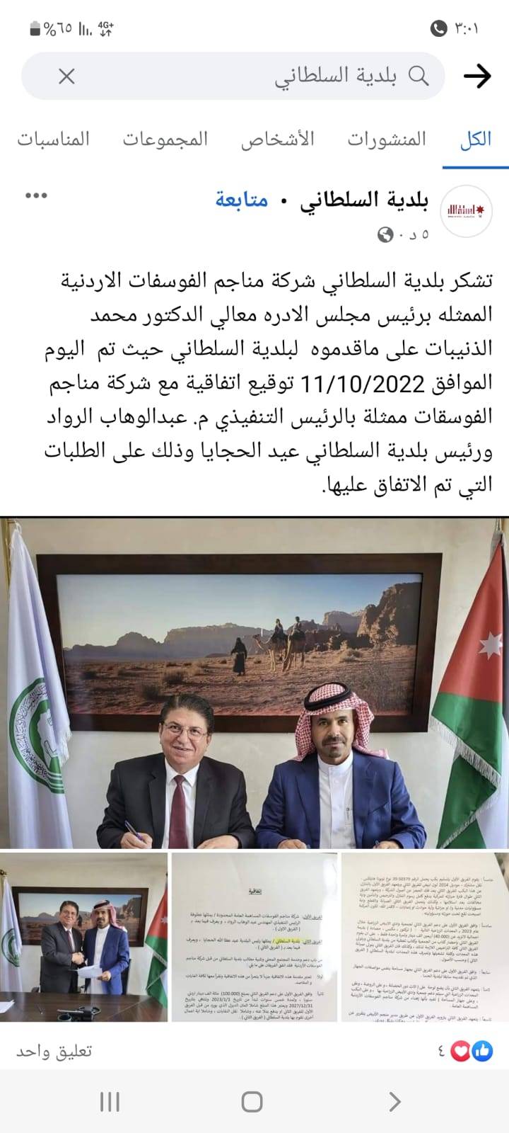 وثمنا تعاون شركة مناجم الفوسفات الاردنية ممثلة برئيس مجلس ادارتها الدكتور محمد الذنيبات، وأعضاء المجلس، والادارة التنفيذية للشركة، مع بلديات الحسا والسلطاني، مؤكدين ان هذه الاتفاقيات تعكس حرص الشركة على تطوير شراكاتها مع البلديات؛ بما يخدم أهداف وأعمال البلديات، ومسؤولياتها تجاه المواطنين.