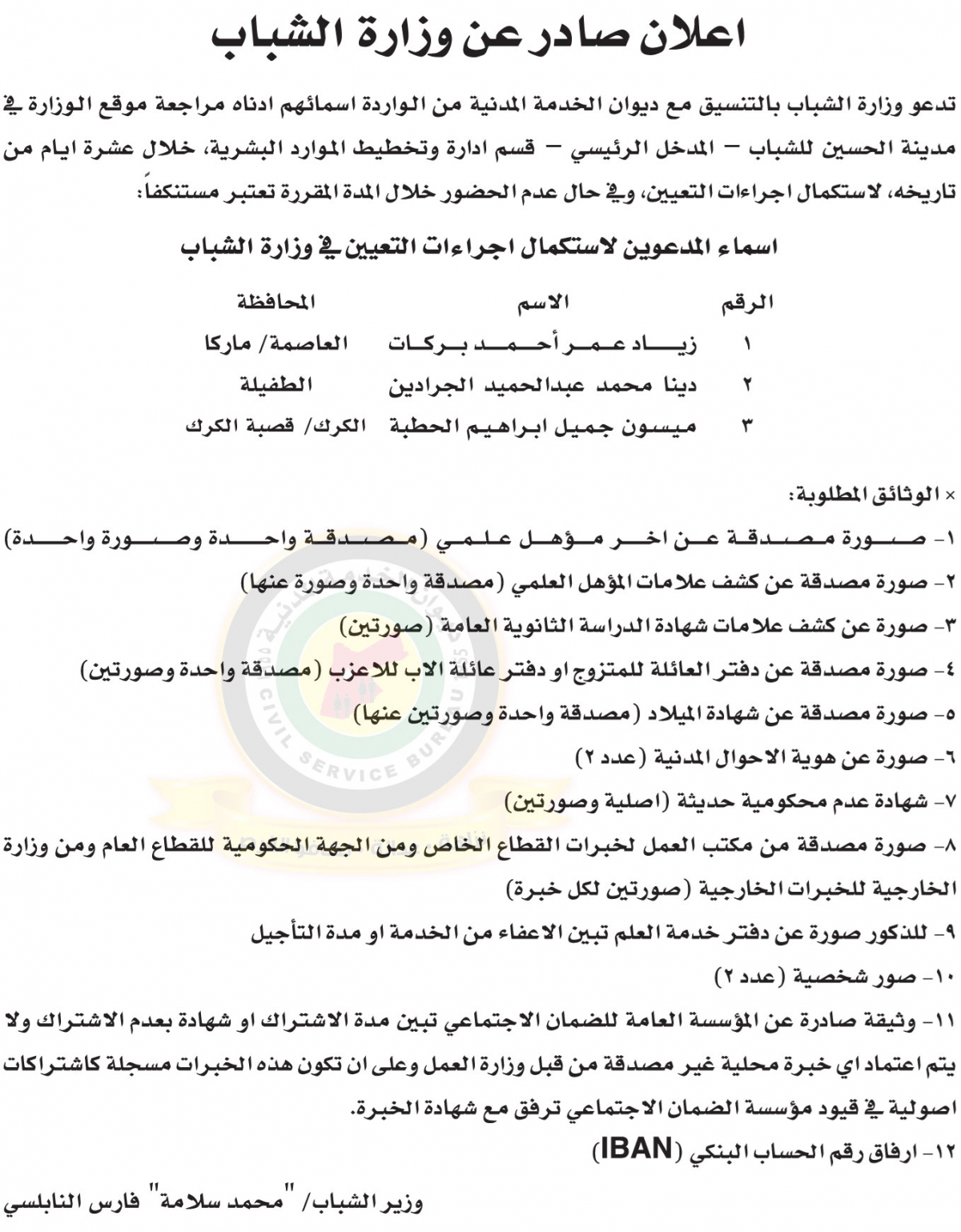 : أعلنت وزارة الشباب وبالتنسيق مع ديوان الخدمة المدنية التالي أسماؤهم لاستكمال إجراءات التعيين.